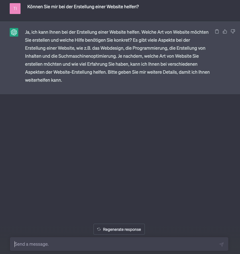 Es ist auch möglich, eine neue Antwort mit der gleichen Frage zu versuchen, indem Sie auf die Schaltfläche Regenerate response über dem Chatfeld klicken.