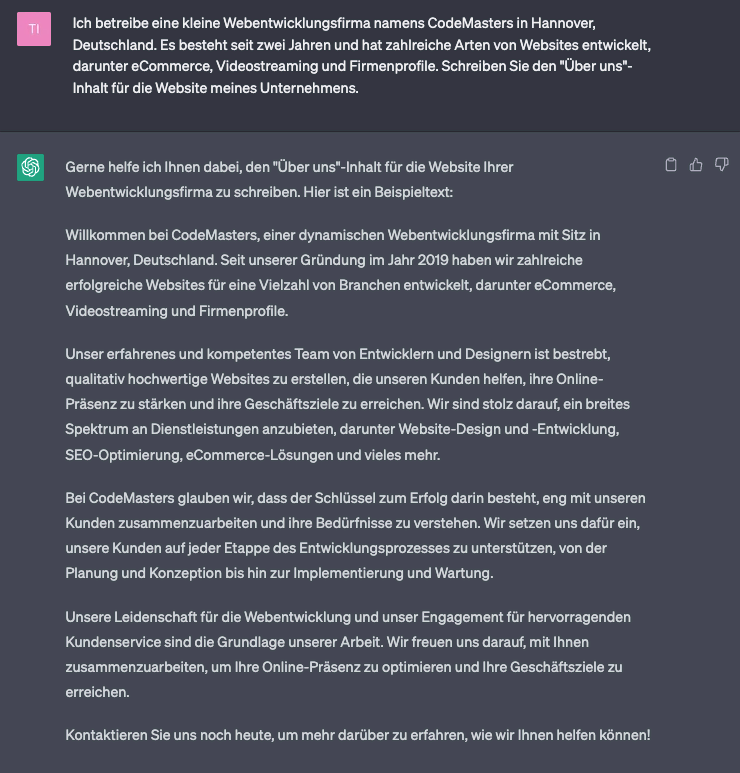 Aufgrund seiner Sprachverarbeitungsfähigkeiten ist die Verwendung von ChatGPT für die Erstellung von Website-Inhalten eine der häufigsten Anwendungen. Die KI kann Ideen und Entwürfe in Sekundenschnelle generieren und spart Ihnen damit Zeit.