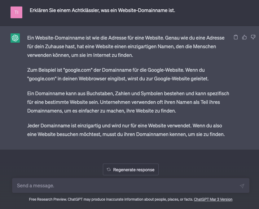 Sie können den Chatbot zum Beispiel bitten, dass er dasselbe Thema in einer einfacheren Sprache für Schüler der achten Klasse erklärt.