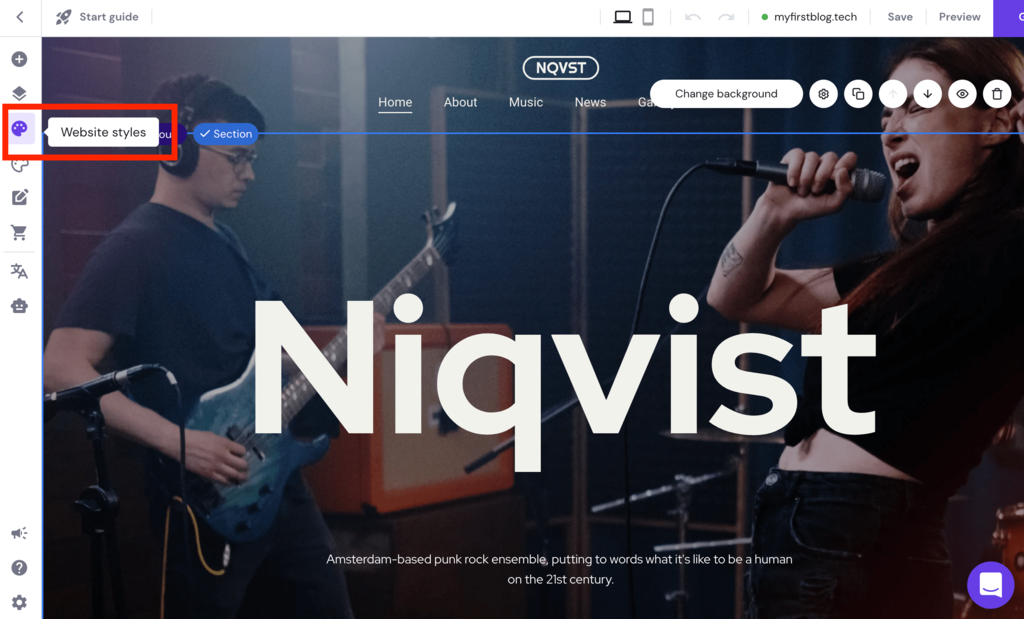 - Stil. Ändern Sie den Kopfzeilen-Hintergrund, indem Sie entweder eine ausgewählte Farbe verwenden oder ein Bild hinzufügen. Wählen Sie außerdem die Farben für Website, Kopfzeilentext und Hover.