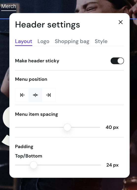 - Layout. Es gibt die Option Sticky Header erstellen, damit die Kopfzeile oben auf der Webseite bleibt, auch wenn Besucher nach unten scrollen. Außerdem können Sie die Position des Menüs und den Abstand zwischen den Elementen nach Ihren Wünschen ändern.