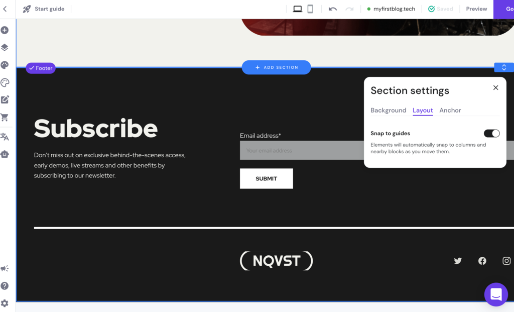 Um die Fußzeile anzupassen, klicken Sie auf den Abschnitt und wählen Sie das Zahnradsymbol.