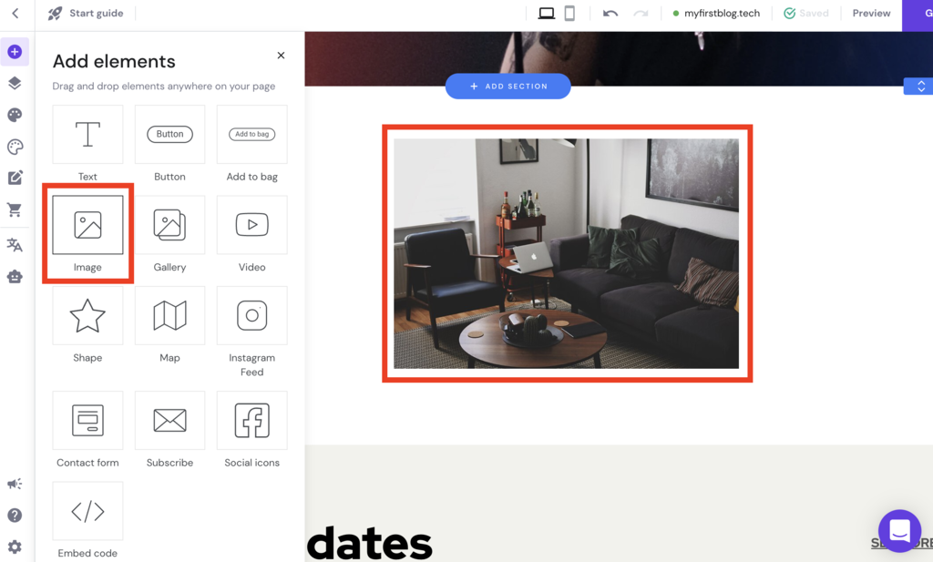 Klicken Sie unter Elemente hinzufügen auf Bild und ziehen Sie es auf Ihre Seite. Positionieren Sie das Element an der gewünschten Stelle auf der Webseite.