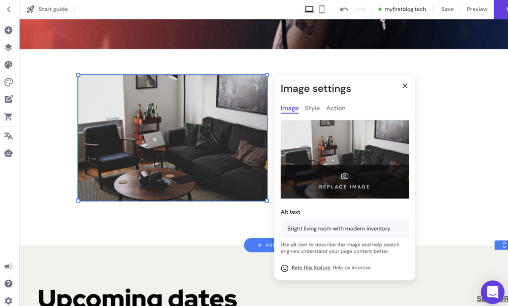 Klicken Sie dann auf die Schaltfläche Bild ersetzen, um entweder Ihr eigenes Bild hochzuladen oder eines aus der kostenlosen Bildbibliothek von Hostinger mit über einer Million Fotos auszuwählen. Denken Sie bei den Bildeinstellungen daran, einen Alt-Text anzugeben, der das Bild beschreibt.