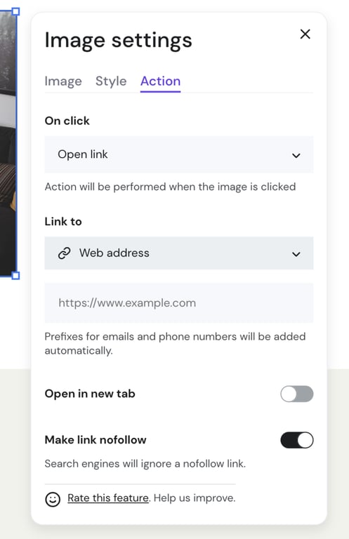 Wählen Sie unter Aktion, was passieren soll, wenn ein Besucher auf das Bild klickt: