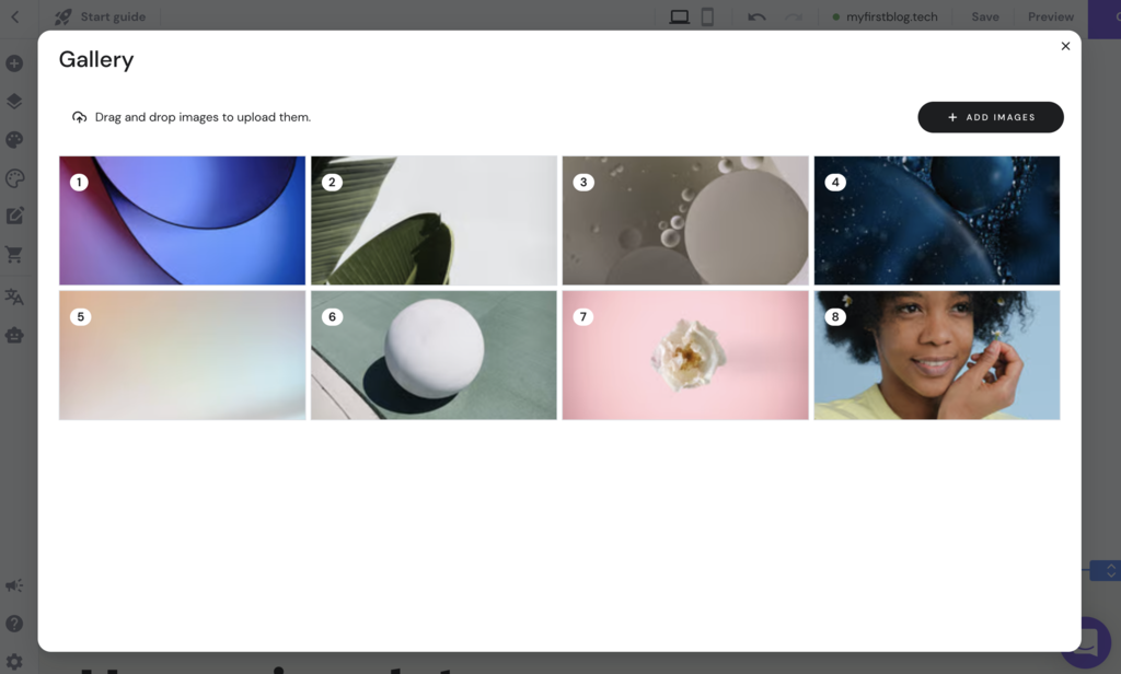 Wählen Sie das Galerie-Element und ziehen Sie es auf die Seite, um mehrere Bilder auf einmal einzubinden.