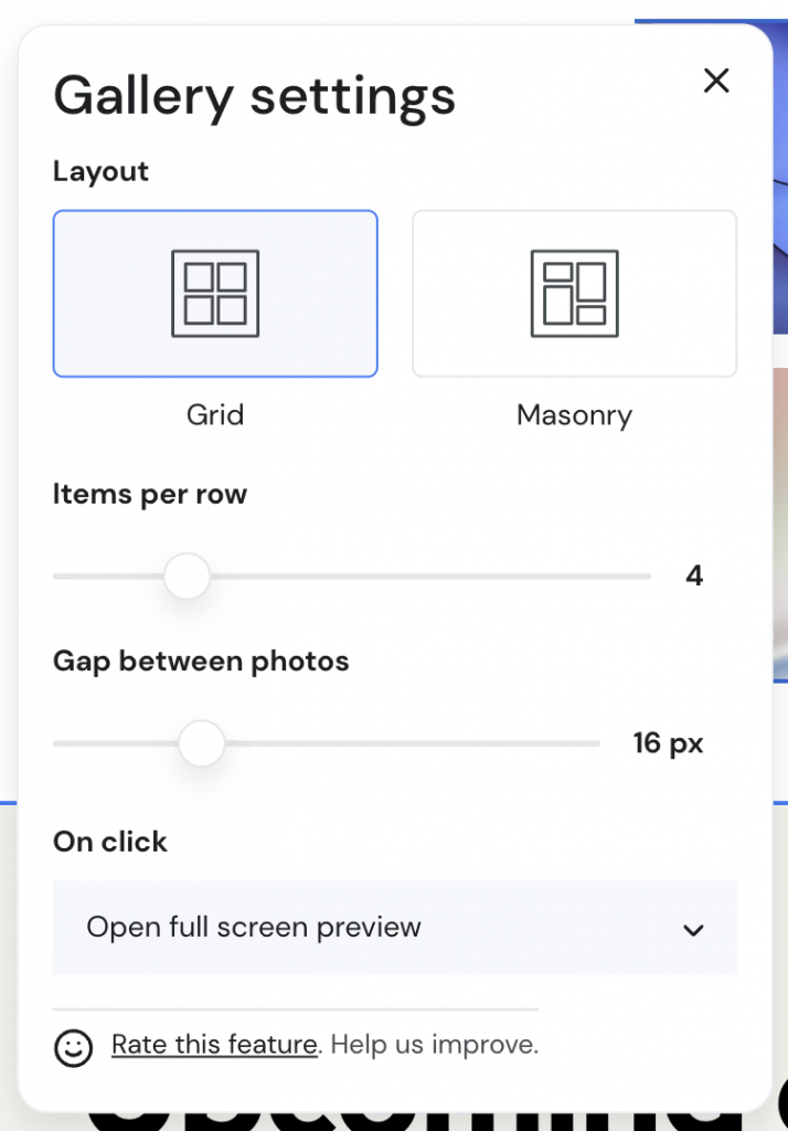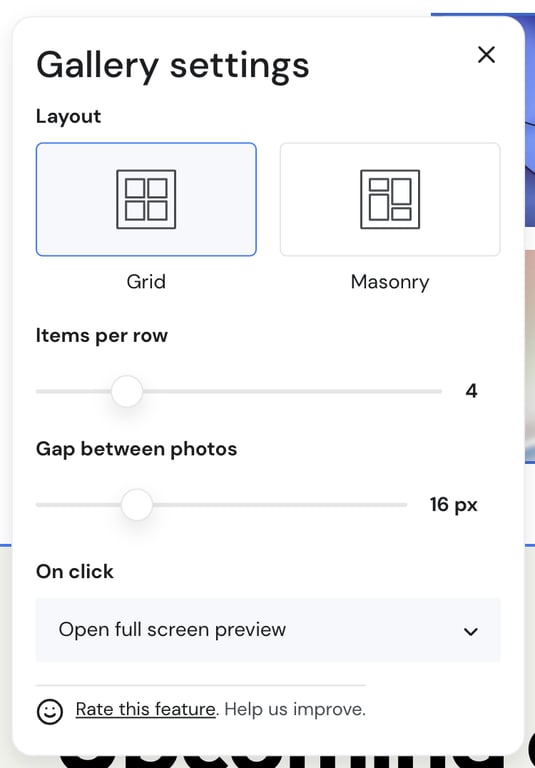 Sobald Sie Ihre Bilder hinzugefügt haben, klicken Sie erneut auf das Element und wählen Sie das Zahnradsymbol. Ändern Sie unter den Galerie-Einstellungen das Layout, die Elemente pro Zeile, den Abstand zwischen den Fotos und welche Aktion beim Draufklicken ausgeführt werden soll.