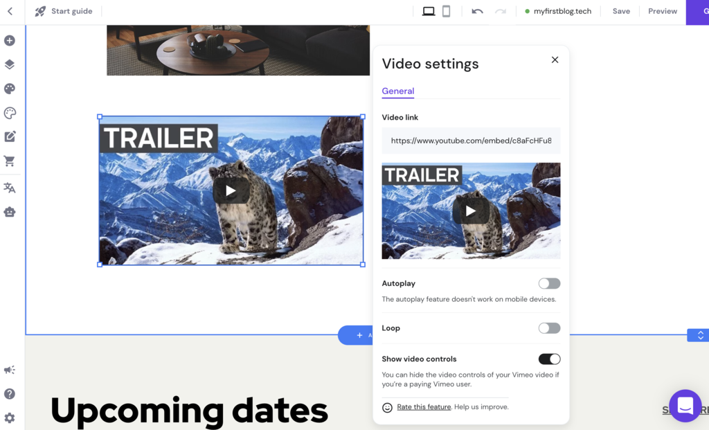 Das Hinzufügen von Videos ist anders als das von Bildern. Bei Hostinger müssen Sie das Video zuerst auf YouTube oder Vimeo hochladen.