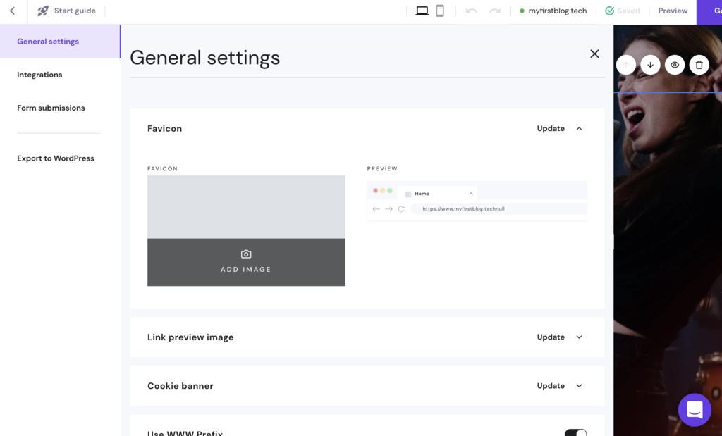 Um ein Favicon auf Ihrer Website hochzuladen, gehen Sie zu den Website-Einstellungen in der unteren linken Ecke Ihres Editors. Wählen Sie dann Allgemeine Einstellungen, um fortzufahren.