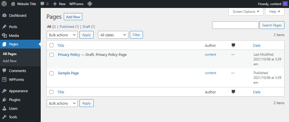 Um Ihre erste Seite auf einer neuen Website zu erstellen, gehen Sie zu Dashboard -> Seiten -> Neu hinzufügen.