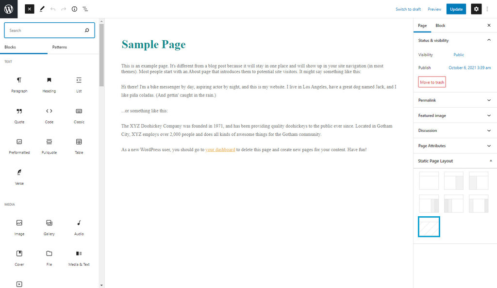 Wenn Sie eine Website-Page erstellen, legen Sie den Schwerpunkt auf informative und genaue Inhalte sowie eine benutzerfreundliche Navigation. WordPress verfügt über integrierte Blöcke, die Ihnen bei der Erstellung von Inhalt und Layout helfen. Drücken Sie auf das +-Symbol in der oberen linken Ecke und blättern Sie durch alle Blöcke, um eine Seite zu optimieren.