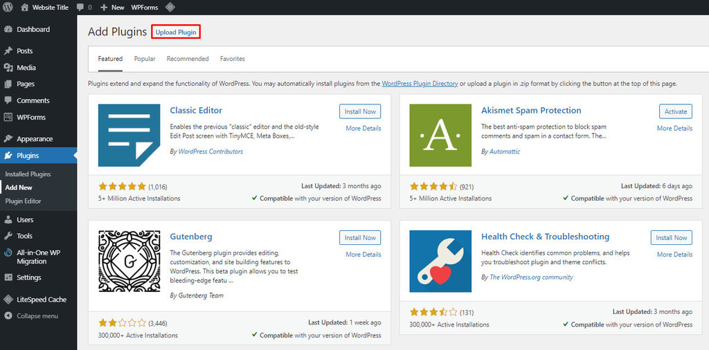 Premium-Plugins laden Sie manuell hoch, nachdem Sie sie gekauft haben. Gehen Sie zu WordPress Dashboard -> Plugins -> Neu hinzufügen, und klicken Sie auf Plugin hochladen, um Ihre Premium-Plugins zu installieren und zu aktivieren.