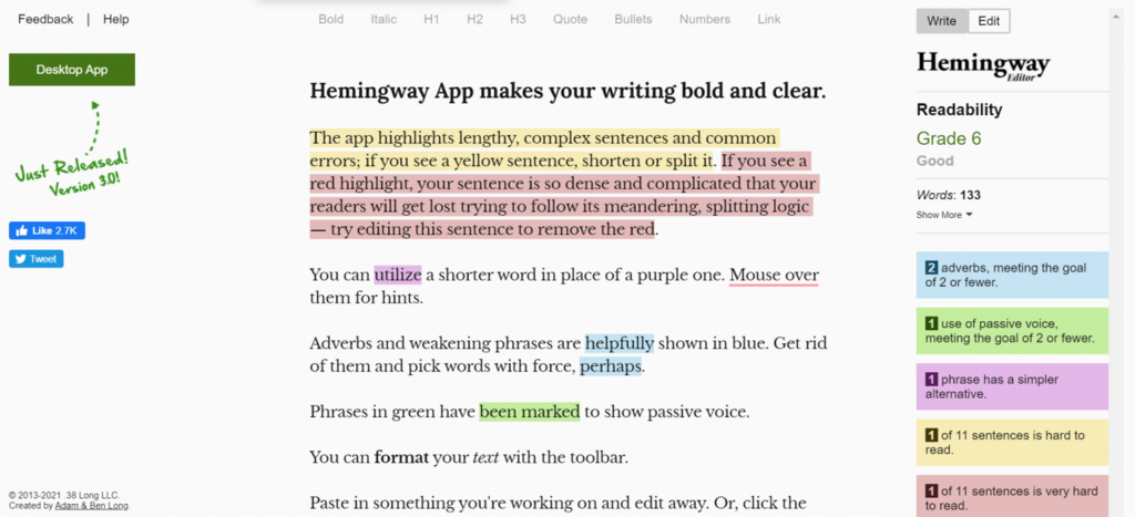 - Beseitigen Sie Adverbien und Füllwörter – verwenden Sie eine App wie Hemingway Editor, um Adverbien und Füllwörter aufzuspüren, die den Inhalt schwach klingen lassen.