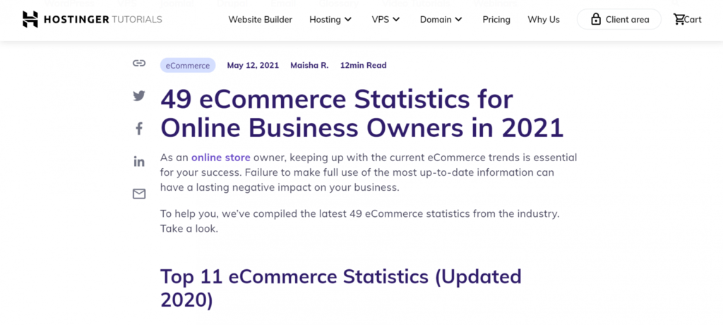 - Kuratierte Beiträge – kuratierte Inhalte sind eine Auswahl an nützlichen Ressourcen zu einem bestimmten Thema. Diese Art von Beitrag ist geeignet, um Inhalte wie Statistiken oder Branchenbeispiele zu sammeln. Hier ist ein ausgewählter Beitrag Beispiel von unserem Blog über die neuesten eCommerce Statistiken: