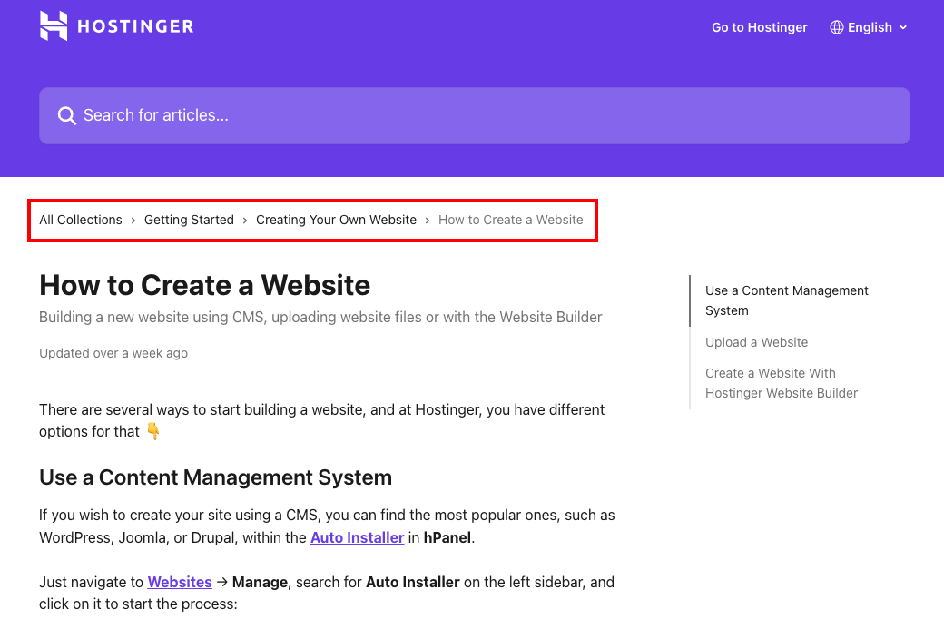 Anstatt nach anderen Artikeln zu suchen oder auf die Zurück Schaltfläche zu klicken, können Website-Besucher einfach auf Erste Schritte oder andere Brotkrumen klicken, um mehr Informationen über das Thema zu finden.