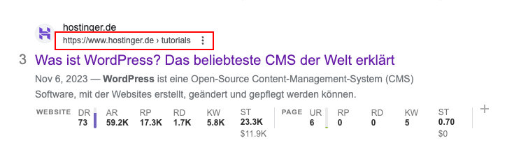 Google zeigt sogar Brotkrumen auf seiner Ergebnisseite an, um den Benutzern zu helfen zu verstehen, ob die Seite für ihre Suche relevant ist: