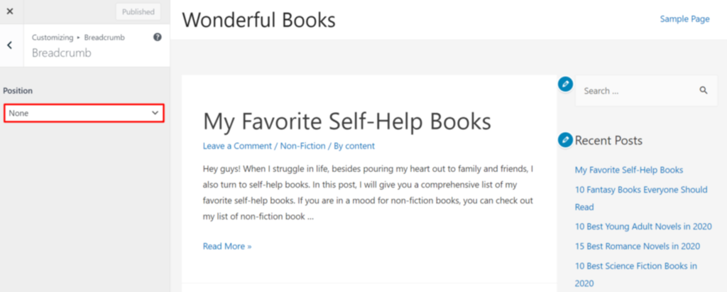 Wählen Sie aus, wo Ihre Brotkrumen angezeigt werden sollen, indem Sie auf eine der Optionen im Dropdown-Menü Position klicken.
