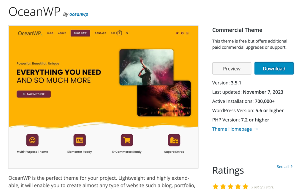 Die kostenlose Version von OceanWP ist mit eingeschränkten Funktionen verfügbar. Ihre Premium-Tarife sind Personal für 39 US$ €/Jahr für eine Seite, Business für 79 US$/Jahr für drei Seiten, und Agency, für 129 US$/Jahr für 25 Seiten.