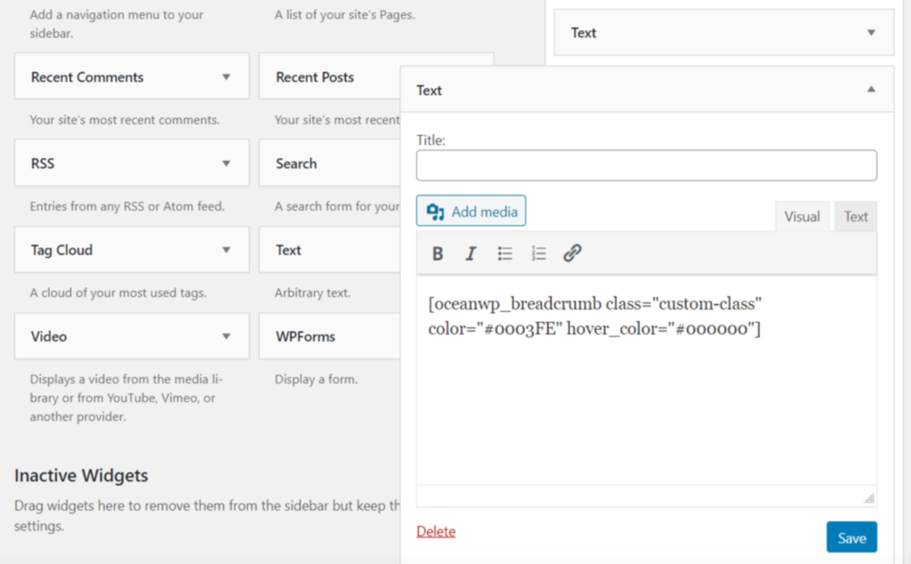 WordPress Widget. Fügen Sie Brotkrumen über die WordPress-Widget-Einstellungsseite hinzu, ohne Ihre Vorlagendateien zu bearbeiten.