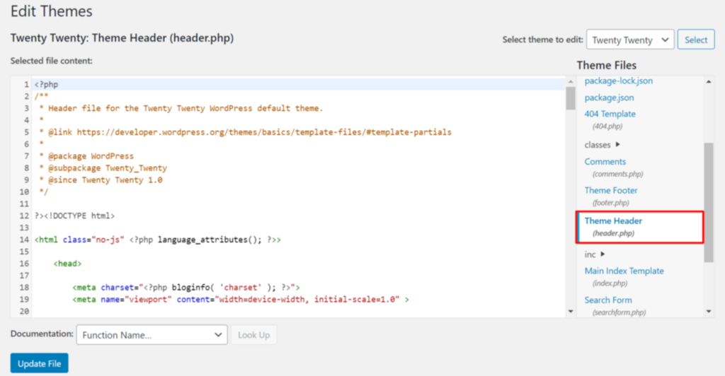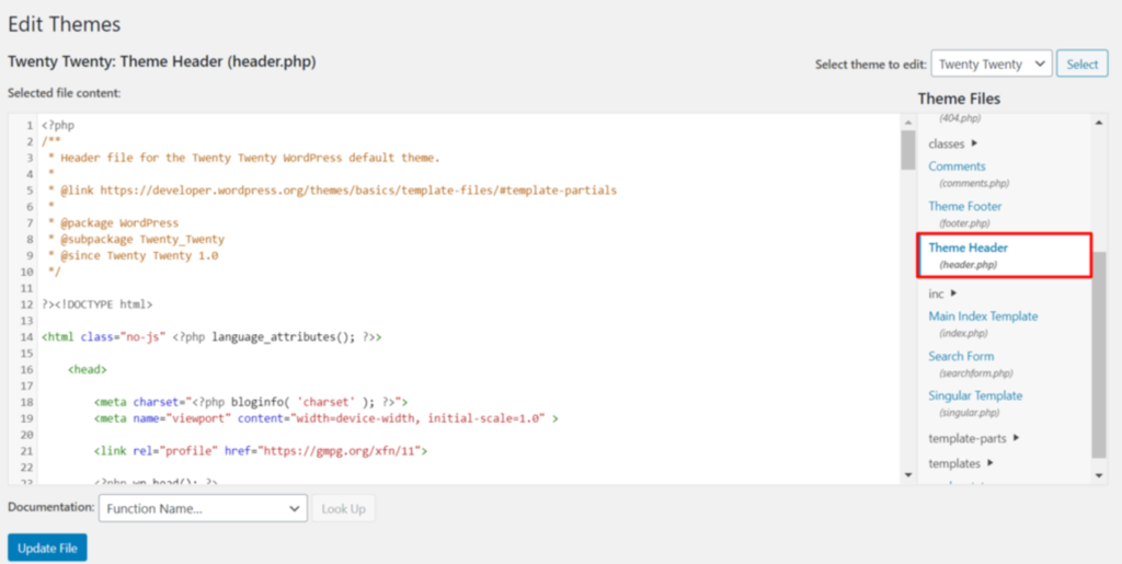 Fahren Sie mit der Maus über Design im Navigationsmenü Ihres WordPress-Dashboards, klicken Sie auf den Theme-Datei-Editor und finden Sie die Datei header.php.