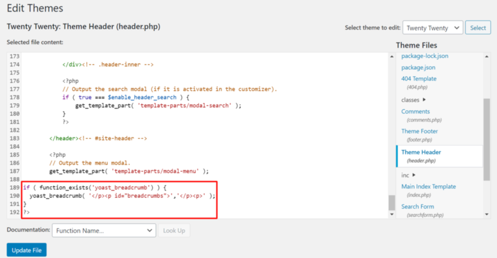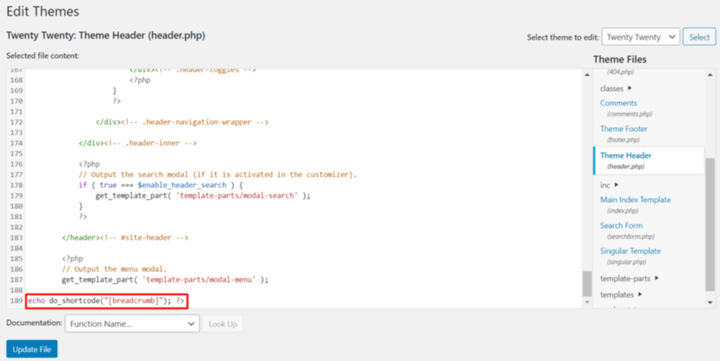 Fügen Sie den Codeschnipsel für Breadcrumbs am Ende Ihrer gewünschten Datei ein und klicken Sie auf Datei aktualisieren, um Ihre Änderungen zu speichern.