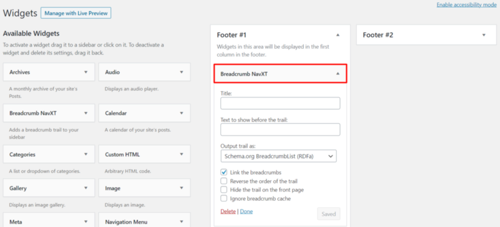 Finden Siedas Breadcrumb NavXT Widget in der Listeder verfügbaren Widgets.