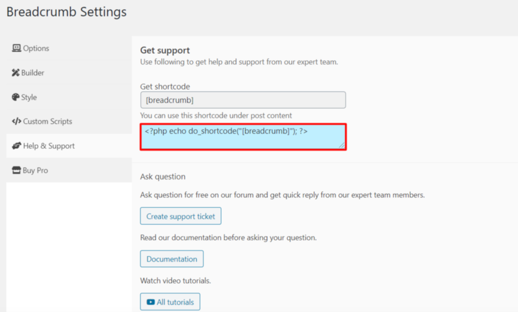 Wenn Sie fertig sind, klicken Sie auf den Tab Hilfe & Unterstützung, um den Shortcode zu kopieren.