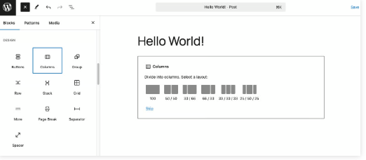 - Öffnen Sie den Block-Inserter → Design → Spalten.
