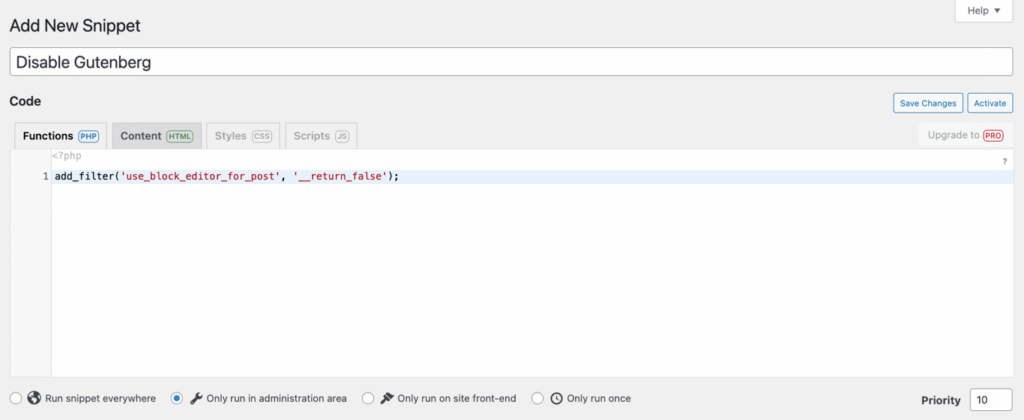 - Benennen Sie den Snippet und fügen Sie den obigen Code dann in den Tab Functions PHP ein. Wählen Sie die Option Only run in administration area.