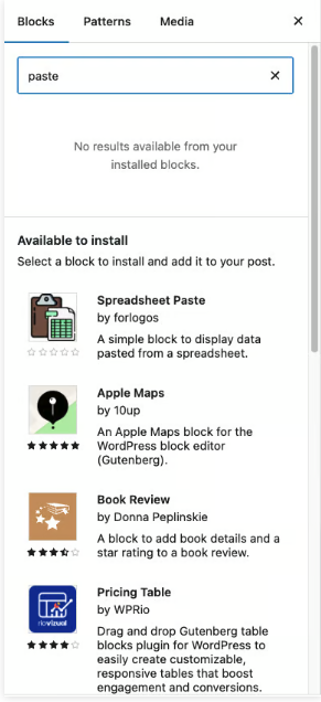 Es stehen sechs Arten von Blöcken zur Auswahl – Text, Medien, Design, Widgets, Theme und Einbettungen. Wenn der benötigte Block nicht verfügbar ist, schlägt der Inserter Optionen aus dem Gutenberg-Block-Verzeichnis vor, das Teil des WordPress-Plugin-Verzeichnisses ist.