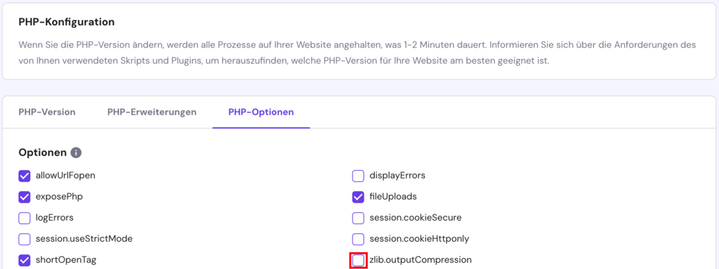 Um diesen Fehler zu beheben, überprüfen Sie, ob PHP korrekt installiert ist und bei der Konfiguration keine Fehler angezeigt werden. Gehen Sie zu PHP-Konfigurationen → PHP-Optionen und stellen Sie sicher, dass Sie zlib.outputCompression deaktivieren.