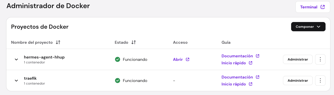 Cuando el despliegue termina, Hermes se ejecuta dentro de un contenedor de Docker y se accede a él a través del terminal. Desde el panel de control de tu VPS, abre el terminal del navegador para conectarte a tu servidor.