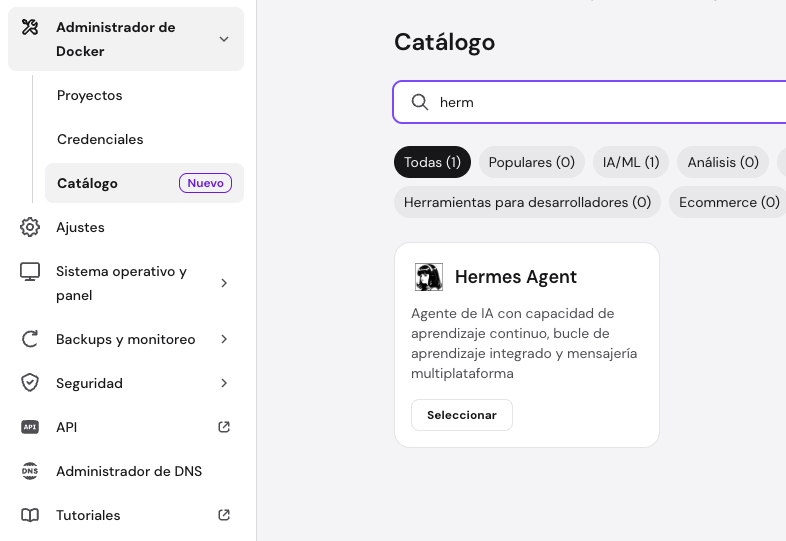 Para empezar, abre el panel de control de tu VPS y ve a Administrador de Docker → Catálogo. Busca el agente Hermes y haz clic en Seleccionar. Durante el despliegue se pide introducir una clave de API de tu proveedor de LLM favorito, como OpenRouter, Anthropic u OpenAI. Esta clave es necesaria para que Hermes interactúe con los modelos de lenguaje y ejecute tareas.