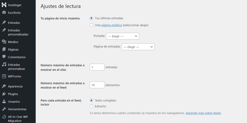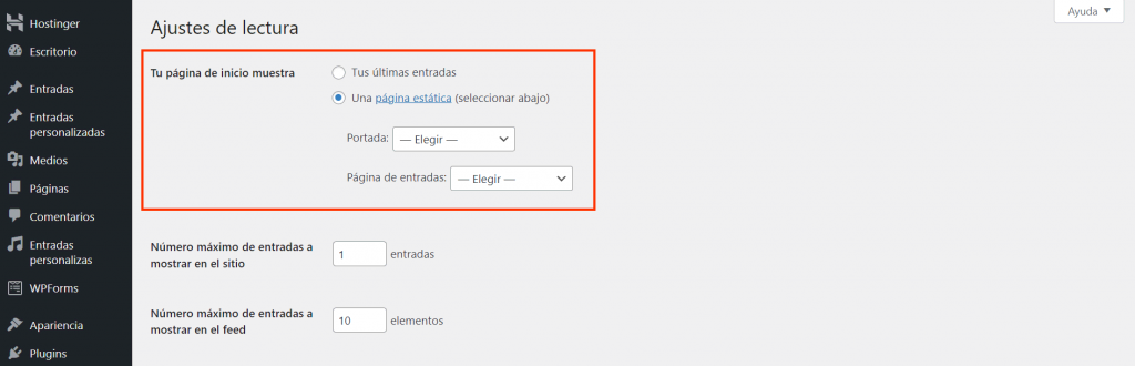 - Ve a Ajustes → Lectura desde el panel de control de tu sitio web para acceder a la configuración de la página de inicio.