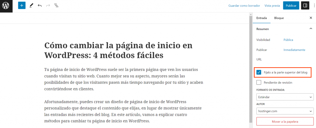 - Edita la entrada que quieres que sea tu nueva página de inicio. Marca Fíjalo a la parte superior del blog para que aparezca siempre al principio de la lista de entradas de tu blog.