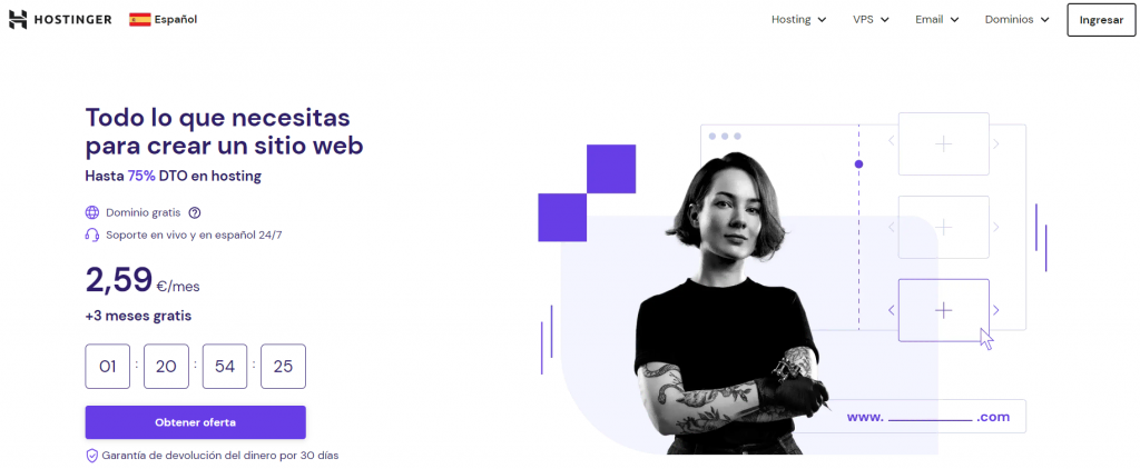 Este es un ejemplo de la página de inicio de Hostinger, en la que se muestra la promoción de alojamiento web actual: