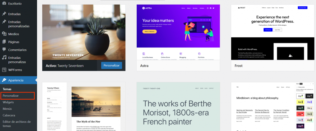 - Ve a Apariencia → Personalizar desde el panel de control de su sitio web.