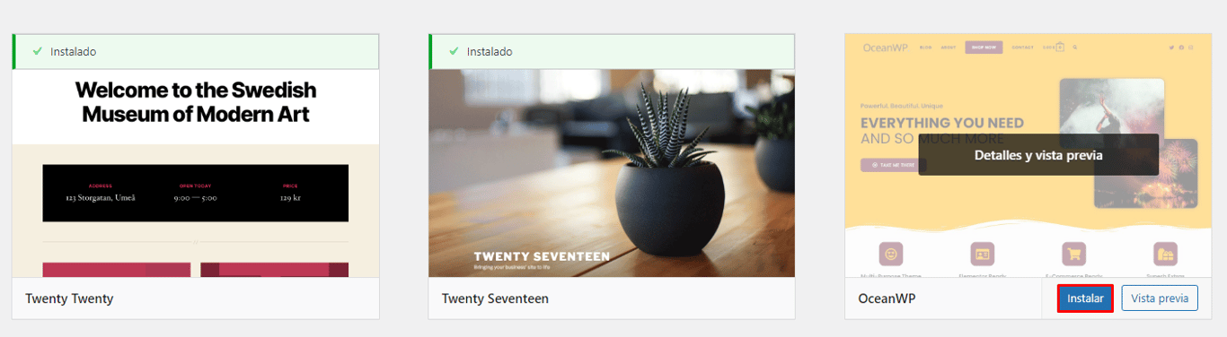 Una vez completado el proceso de instalación, verás los botones de Vista previa y Activar cuando pases el ratón por encima del tema.