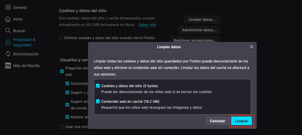 Borrar la caché del navegador en Mozilla Firefox