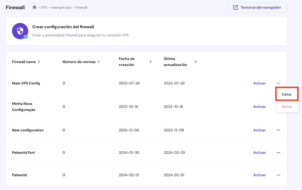 Los usuarios de Hostinger con planes VPS KVM pueden añadir nuevas reglas de cortafuegos directamente desde hPanel, navegando a Seguridad → Firewall. Selecciona Crear configuración de cortafuegos, ponle un nombre y haz clic en Editar para configurarla.