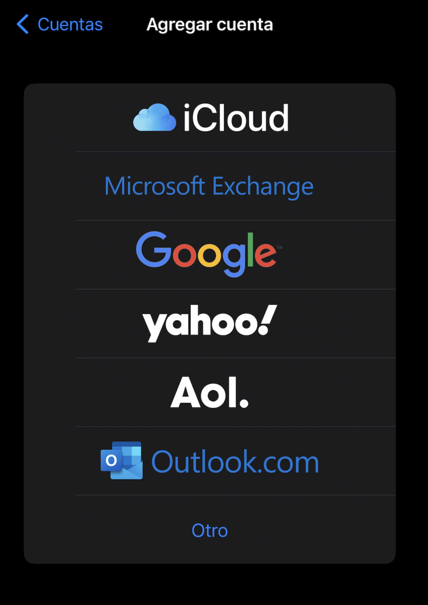 Opciones de correo electrónicos disponibles para añadir en iPhone