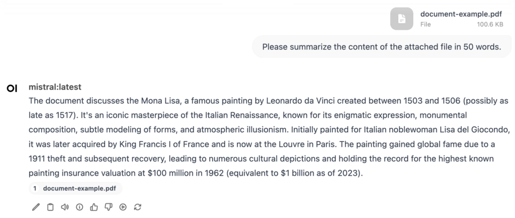 Open WebUI te permite subir documentos en formato DOC, PDF, TXT y RTF. Haz clic en el botón + del campo de solicitud y selecciona Cargar archivos. Elige el documento que quieres subir y escribe una instrucción para el modelo, como por ejemplo: