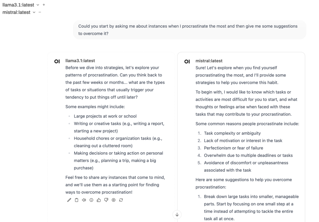 Por ejemplo, puedes empezar con Llama para una discusión general y luego cambiar a Vicuna para una respuesta más especializada sobre el mismo tema.