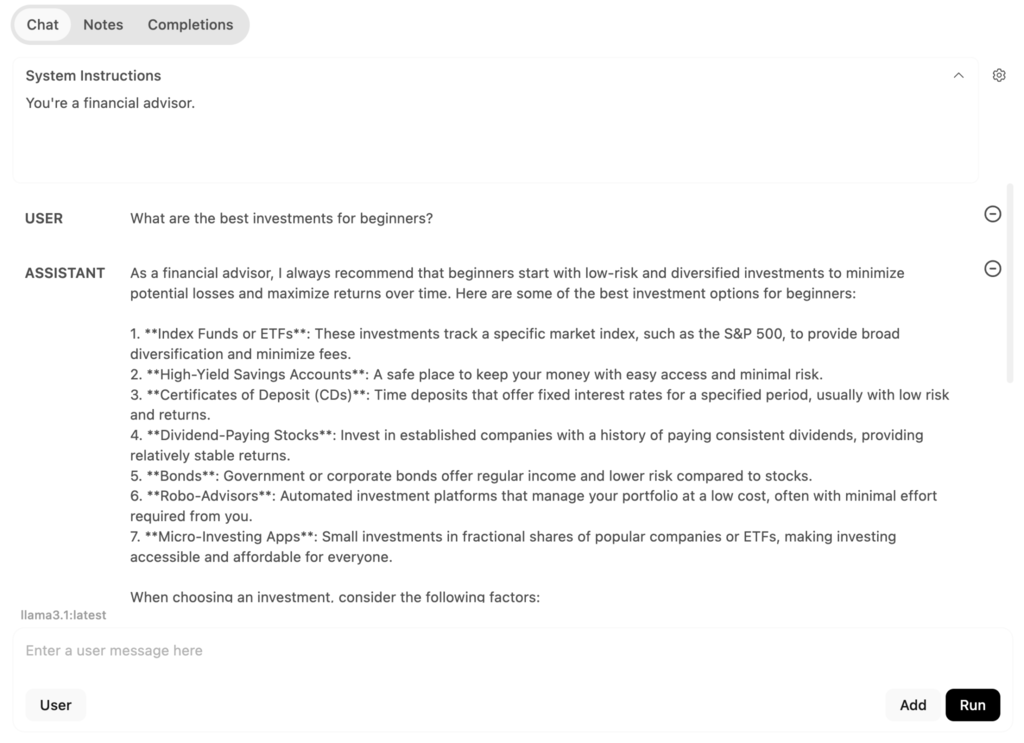 Por ejemplo, si se establecen las instrucciones del sistema en “Eres un asesor financiero” y se escribe una pregunta en el campo del usuario, el modelo responderá desde esa perspectiva.