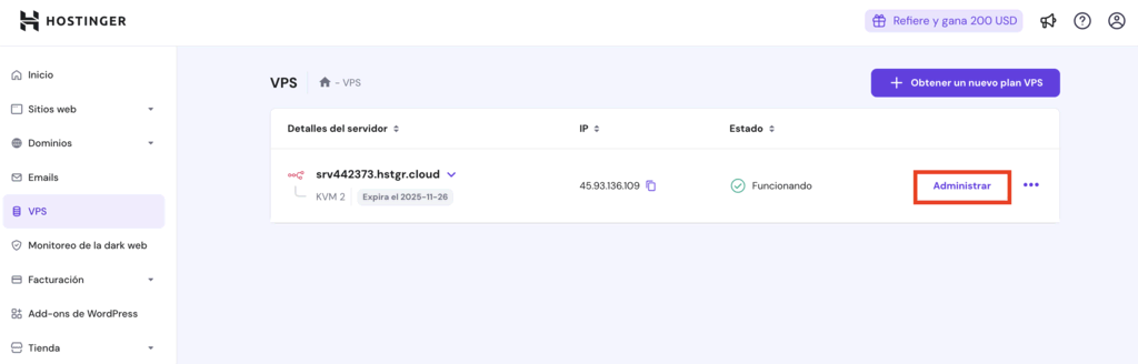 - Inicia sesión en hPanel y navega a VPS → Administrar.