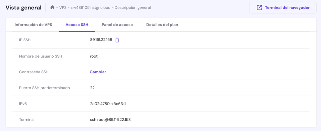 A continuación, conéctate a tu VPS mediante un cliente SSH, como PuTTY, Terminal o nuestra función Terminal del navegador.