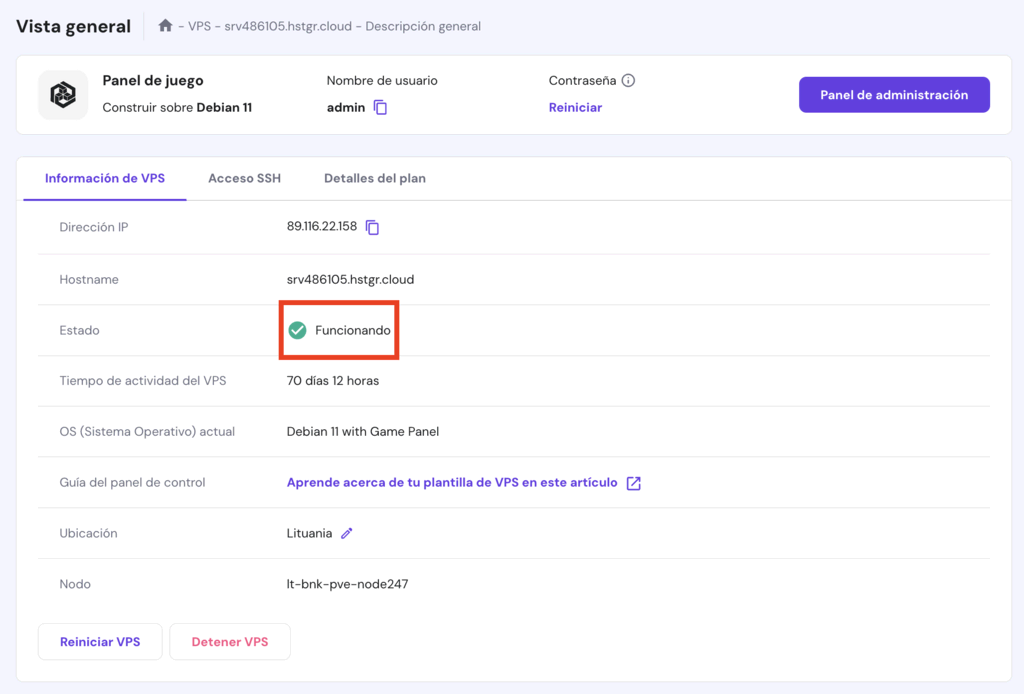 Una vez terminado, serás dirigido al panel de control del VPS. Selecciona la pestaña Información del VPS para comprobar si el estado de tu servidor está Funcionando. Si no es así, inícialo manualmente haciendo clic en el botón Reiniciar VPS.