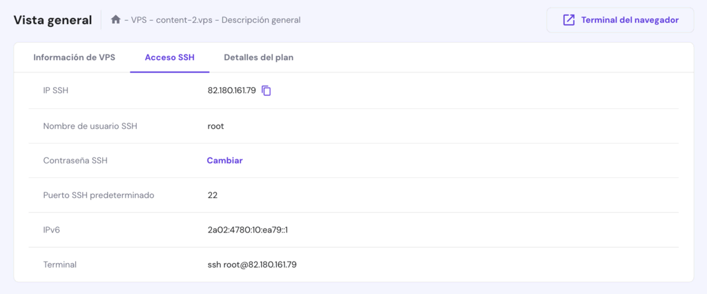 A continuación, ve a la pestaña Acceso SSH. Aquí encontrarás los detalles necesarios para acceder a tu servidor mediante comandos SSH.