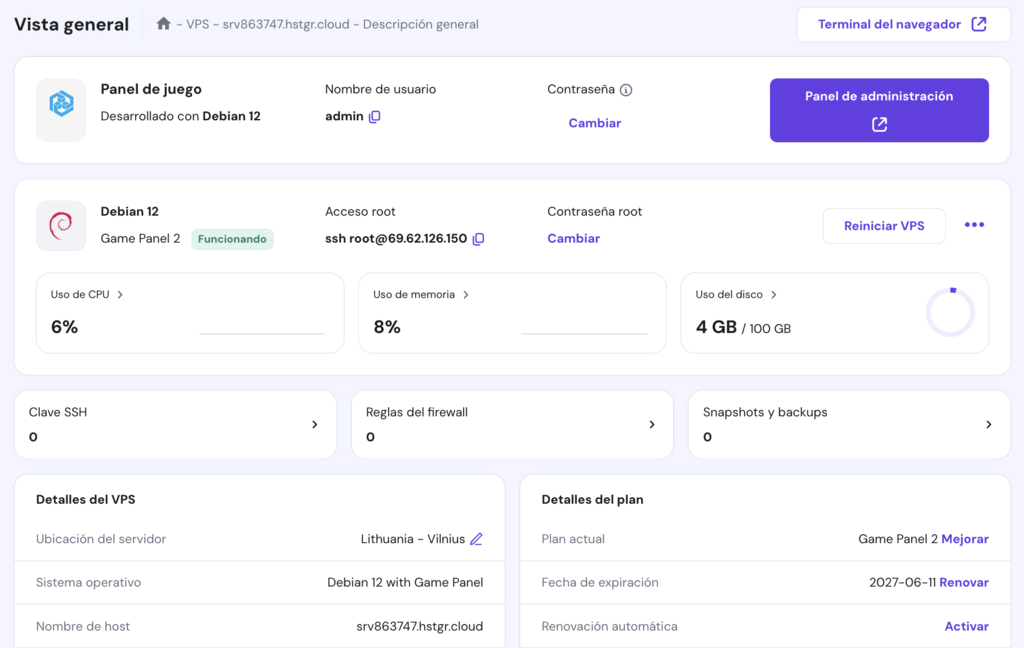 A continuación, accede a tu servidor a través del menú VPS. Puedes ver información como el uso de recursos del servidor, el sistema operativo, el acceso al panel, la dirección IP y las credenciales de acceso SSH.