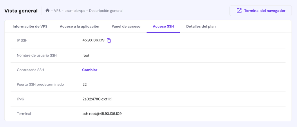 Si utilizas el VPS de Hostinger, obtén la dirección IP del servidor y las credenciales de acceso SSH a través de hPanel. A continuación, conéctate a tu servidor remoto mediante SSH utilizando PuTTY o Terminal y procede con la instalación: